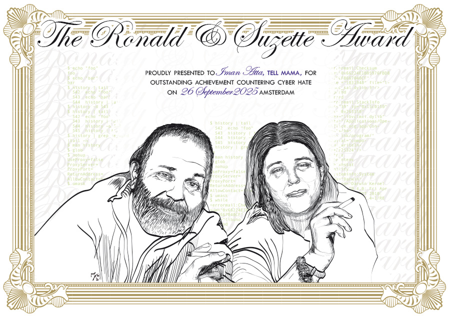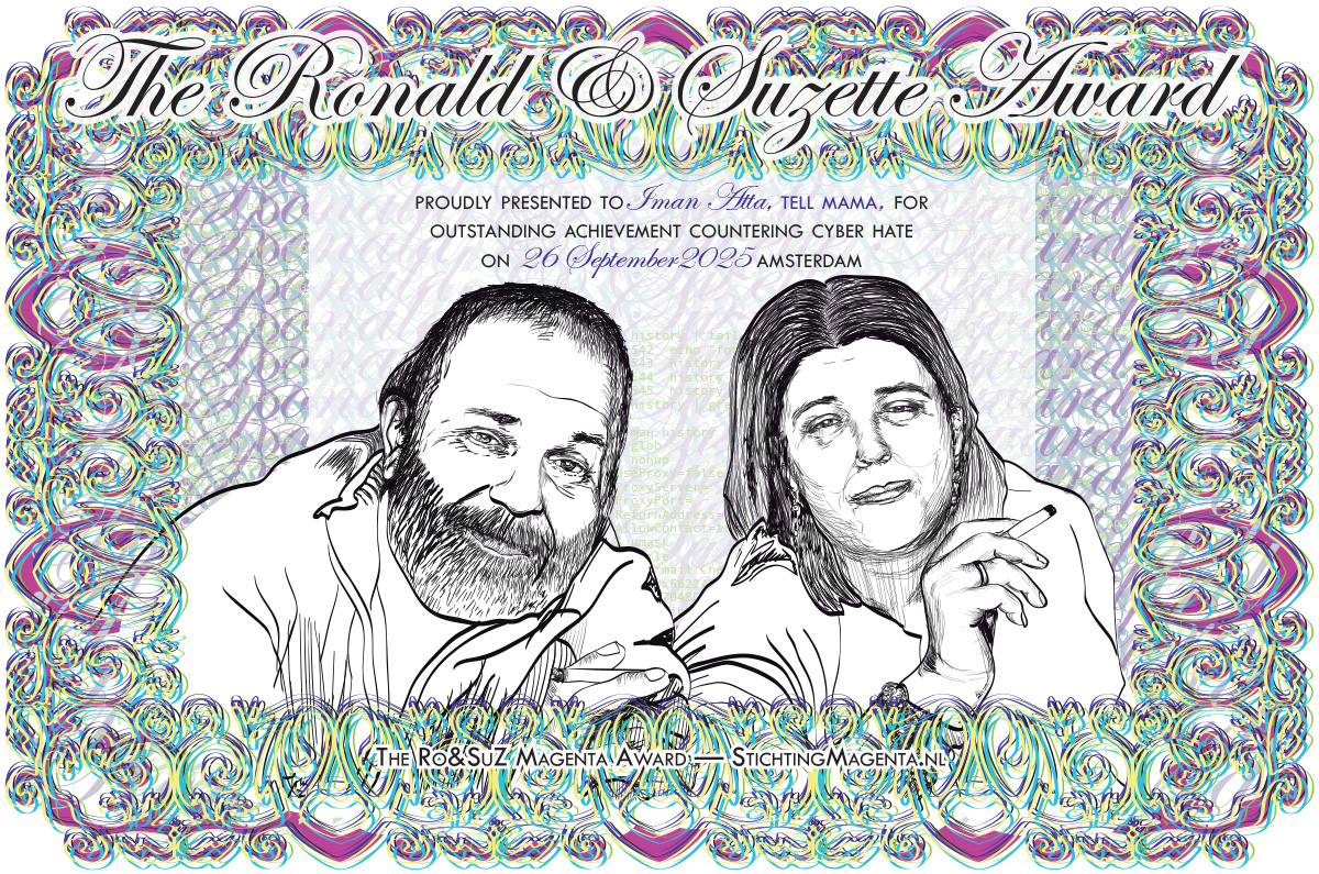 The Ro & SuZ Award derives it’s name from Ronald Eissens (1963-2021) and Suzette Bronkhorst (1958-2021), it’s awarded every year to (an) organization(s) and/or (an) individual(s) that develop()s innovative ways to combat cyber hate or works towards “Bringing the Online In line with Human Rights”.